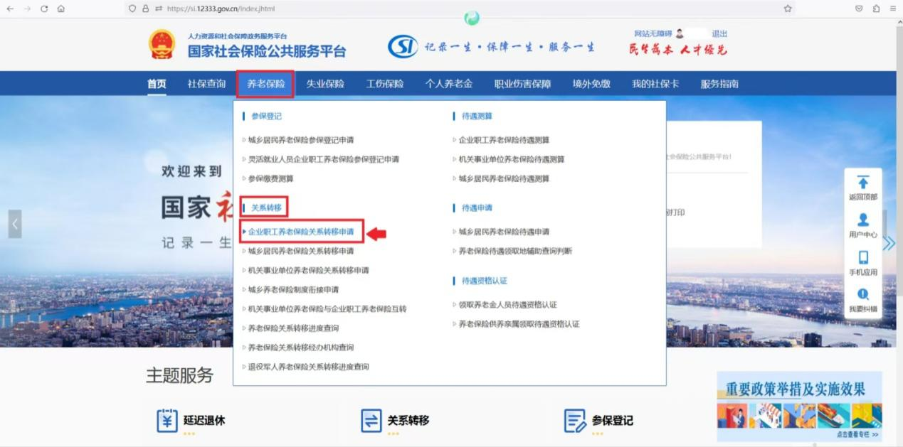 1、登录“国家社会保险公共服务平台”后,选择“养老保险-关系转移”菜单下的对应项目“企业职工养老保险关系转移申请”。