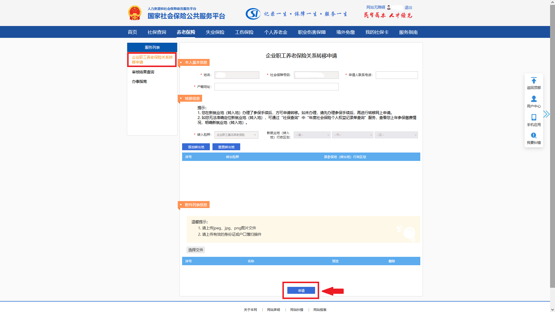 2、点击“服务列表”中的“企业职工养老保险关系转移申请”。填写好“本人基本信息”及“转移信息”,“添加转出地”并保存,点击“选择文件”上传有效的身份证或户口簿扫描件后,点击“申请”确认提交。