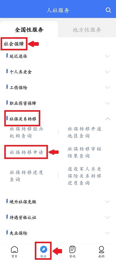 1、登录掌上12333APP后,点击首页底部“服务”,选择“社会保障”菜单下“社保关系转移”中的“社保转移申请”。