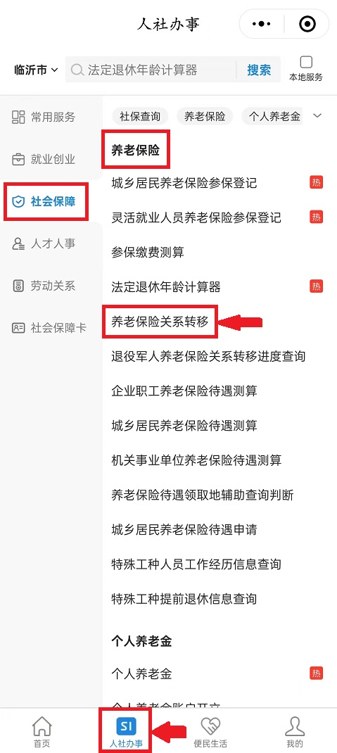 1、登录电子社保卡后,点击首页底部“人社办事”,选择“社会保障”菜单下“养老保险”中的“养老保险关系转移”。