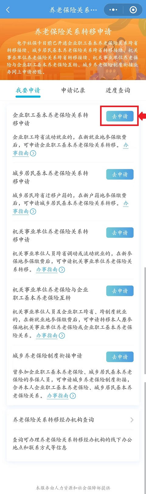 2、企业养老保险跨省转移的,点击企业职工基本养老保险关系转移申请右侧按钮“去申请”。