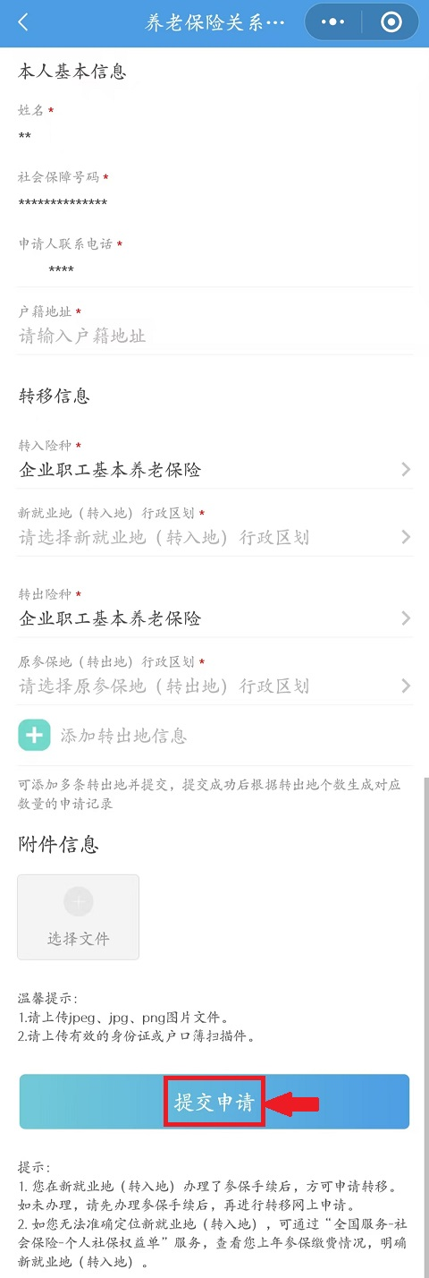 2、点击确认“温馨提示”后,填写“本人基本信息”和“转移信息”,点击“申请”确认提交。