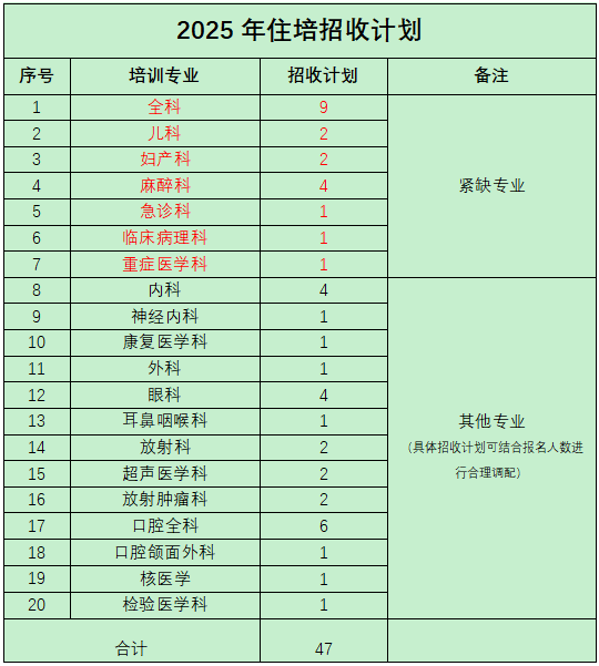 2.全科、儿科、妇产科、麻醉科、急诊科、临床病理科、重症医学科为国家紧缺专业,2025年紧缺专业计划招收20人;其他专业计划招收27人,其他专业招收可根据专业基地容量和报名人数做适当调整。对于未被录取且服从调剂的报考人员可先进行院内调剂,优先满足全科等紧缺专业。